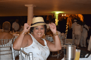 Monica in hat at white party